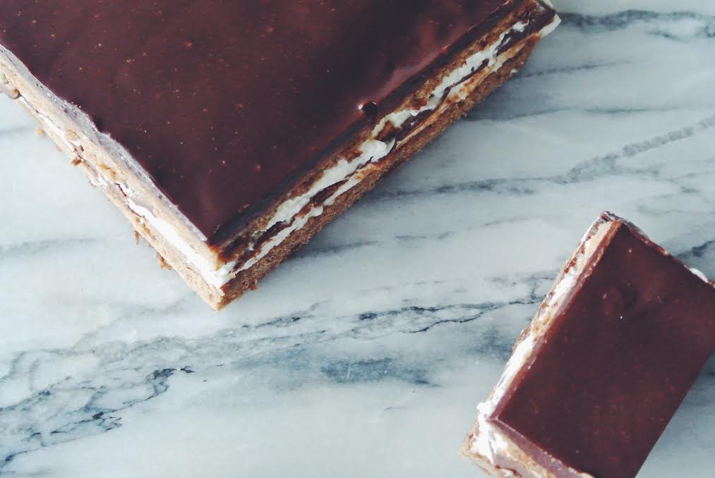 Sieve the icing sugar in to the cream, whisk the cream until you have soft peaks. Spread a thin layer over the set chocolate and put back in the fridge.