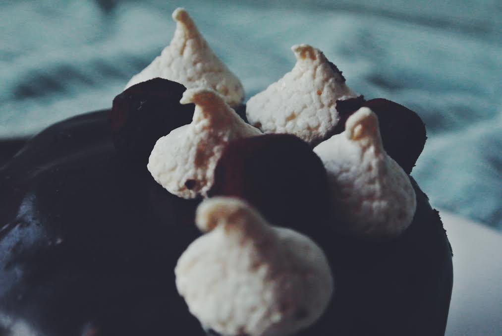 The problem I have when making cake is that there are only two of us and as my Husband doesn’t have a massive sweet tooth making a full size cake is a waste. This cake was small enough to be able to hold in one hand! It is 3 layers of chocolate sponge sandwiched together with chocolate ganache and caramel. It is then covered in caramel buttercream and has chocolate ganache drizzled over the top with tiny meringue kisses and hand rolled truffles!