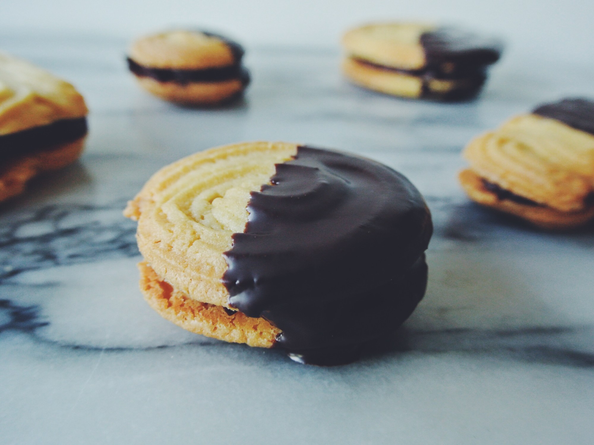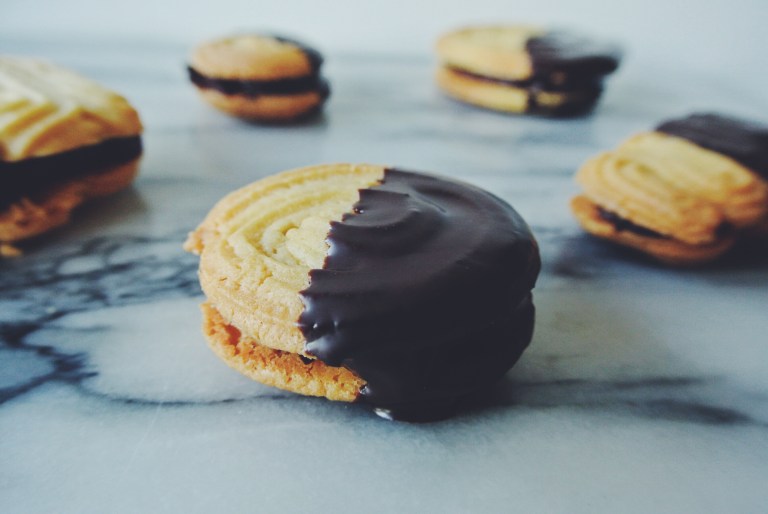 This months theme was biscuits, Greta challenged me to bake Flammende Herzen. I have seen these in bakeries before but I have never tried them. The best way to describe them is they are quite a short crumbly biscuit, not too dissimilar from a shortbread, sandwiched together with a nougat-chocolate ganache and then dipped in a chocolate glaze… what is there not too love?!