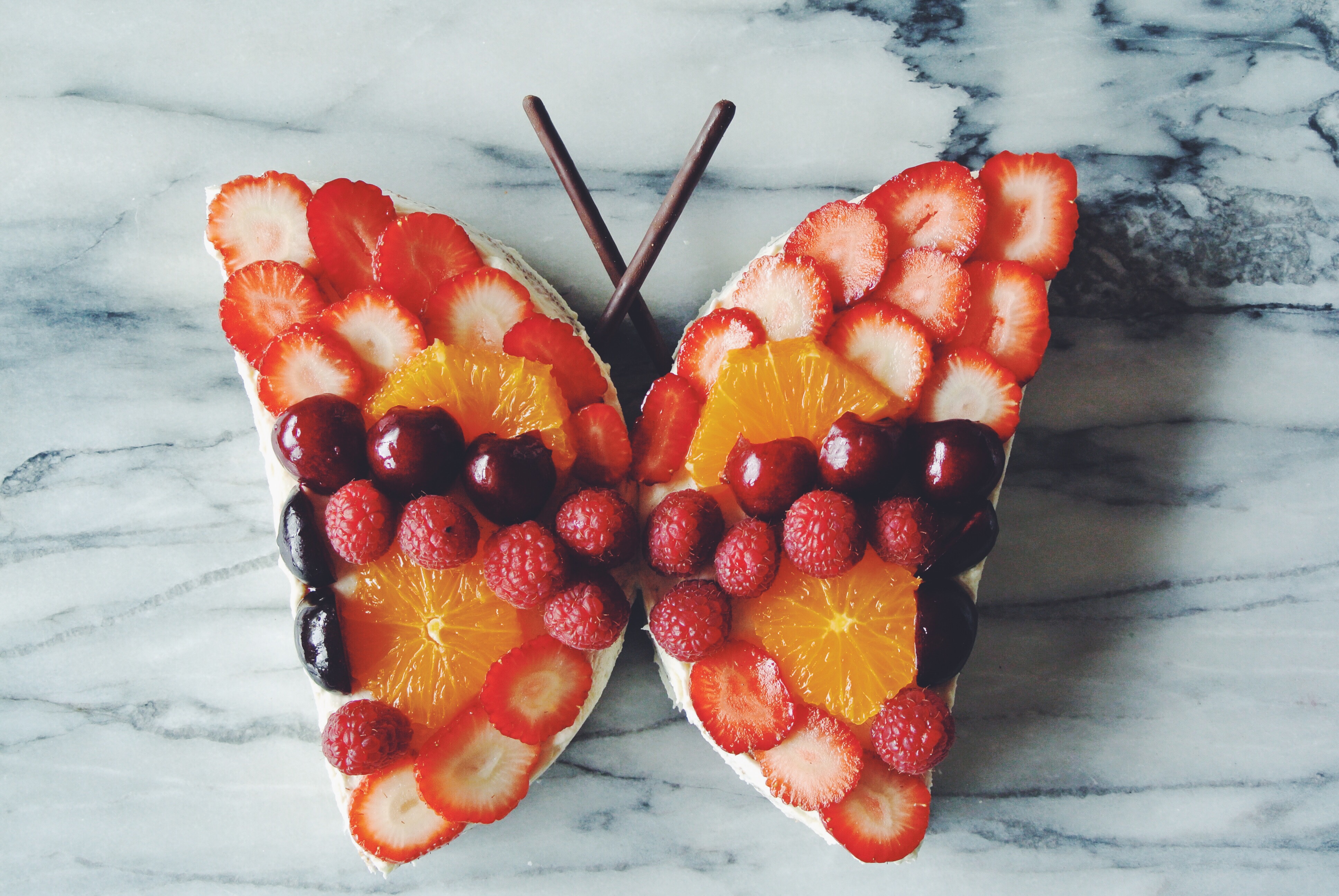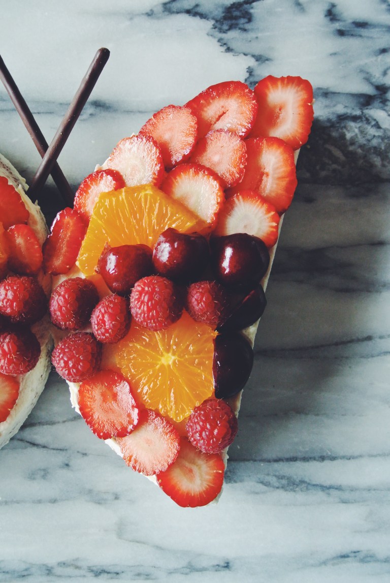 Finally, decorate with fruit and stick the Mikado sticks into the cake as the butterfly’s antenna!