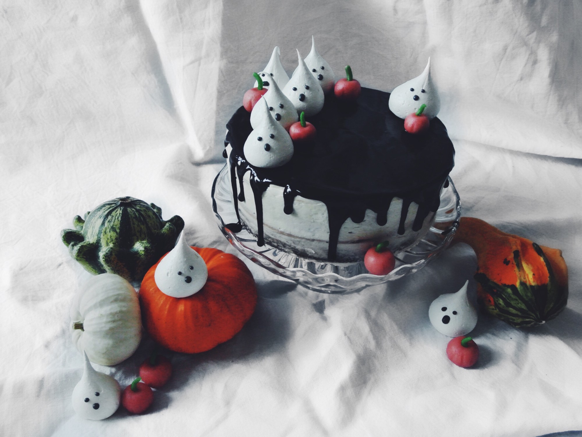 I decorated my cake with marzipan pumpkins and meringue ghosts!