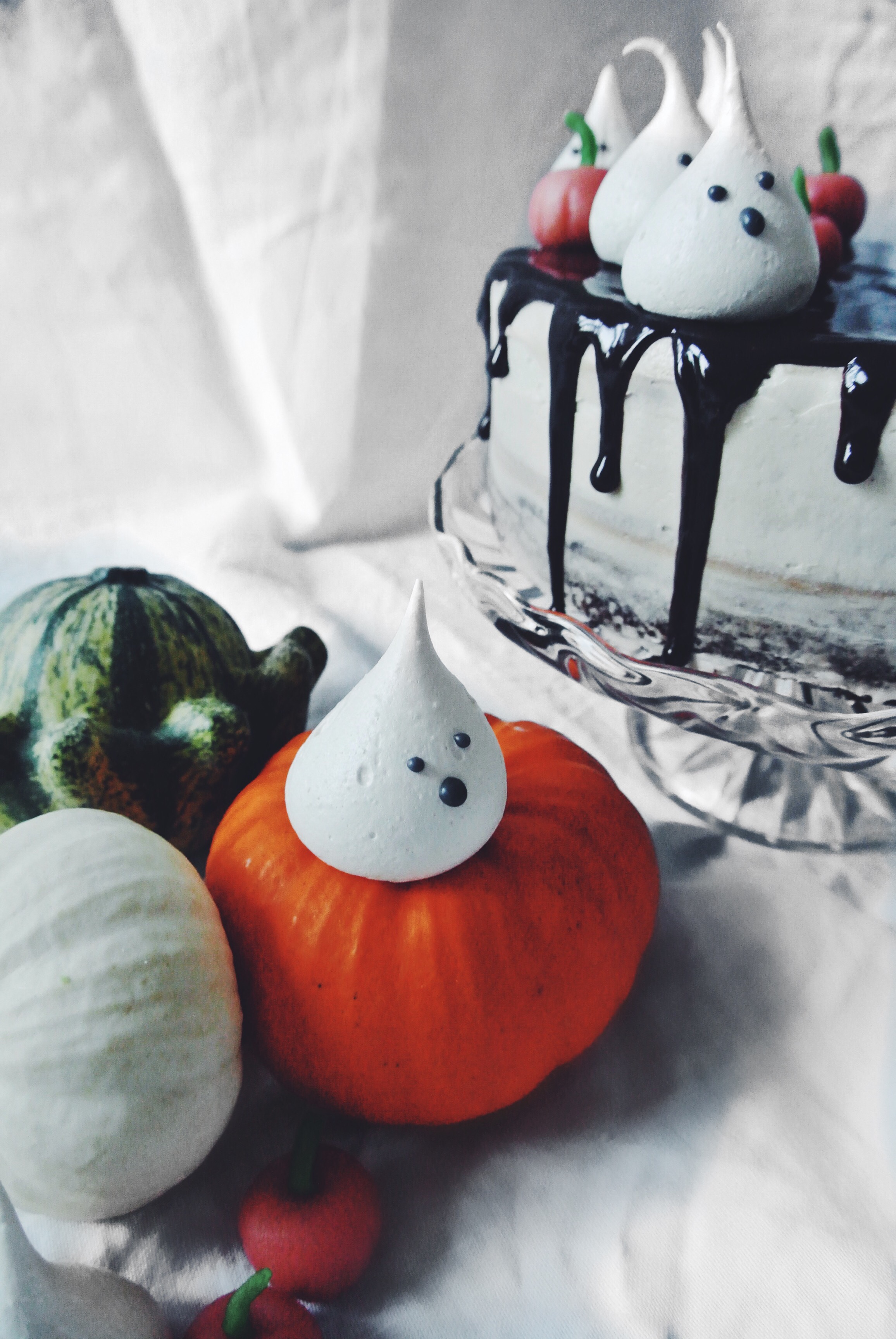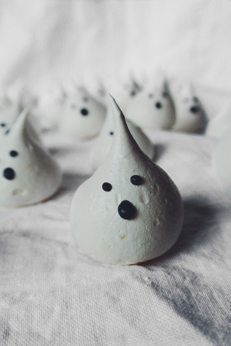 To pipe the faces I make a small piping bag out of baking paper and cut a very small hole in the end. You could also use a piping bag with a really small nozzle. Then have fun piping faces on to your meringue ghosts!