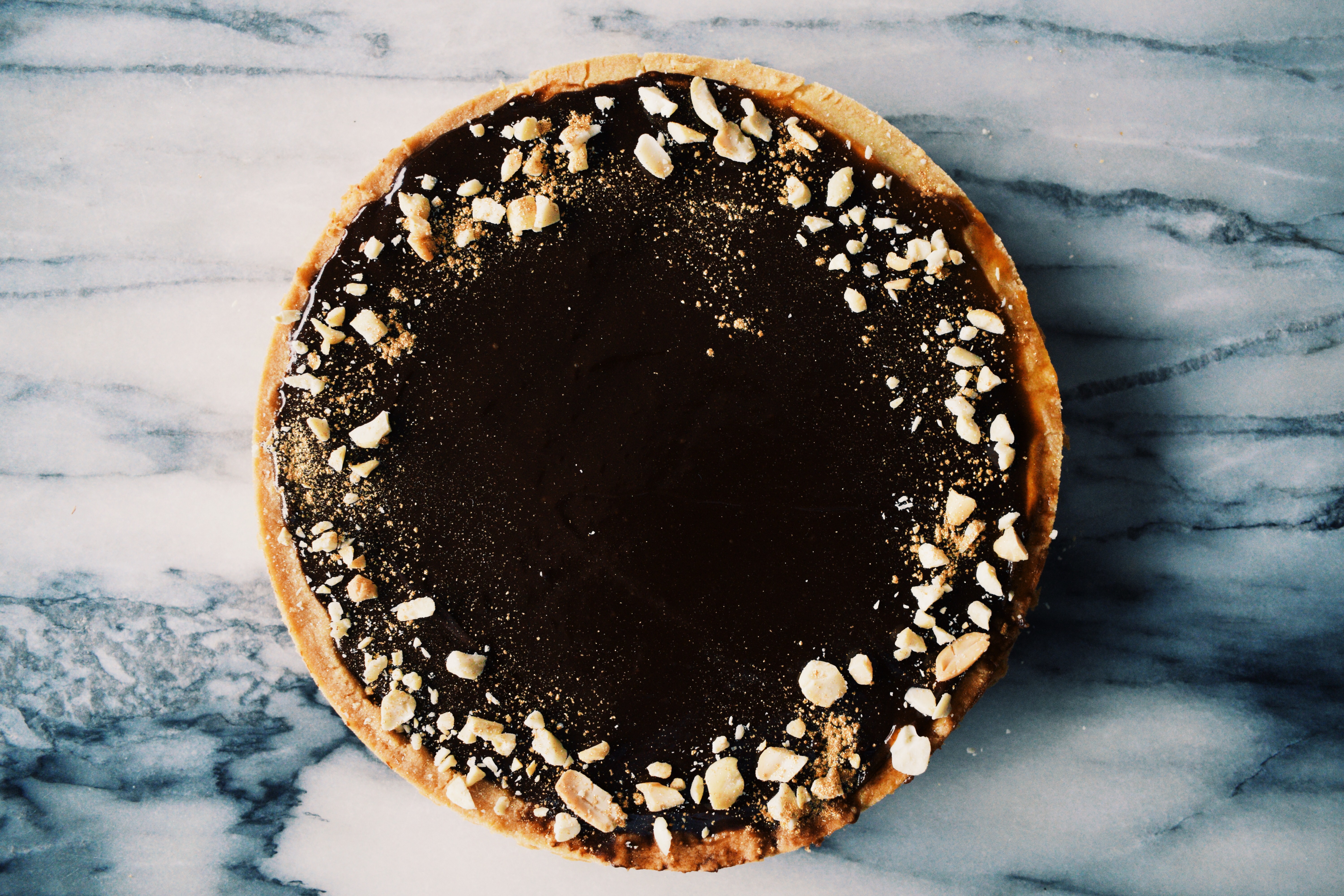 Sprinkle the peanut pieces over the bottom of the baked pastry case. Pour approximately half of the caramel over the peanuts, it should still be fluid enough to cover the base without using a spoon.