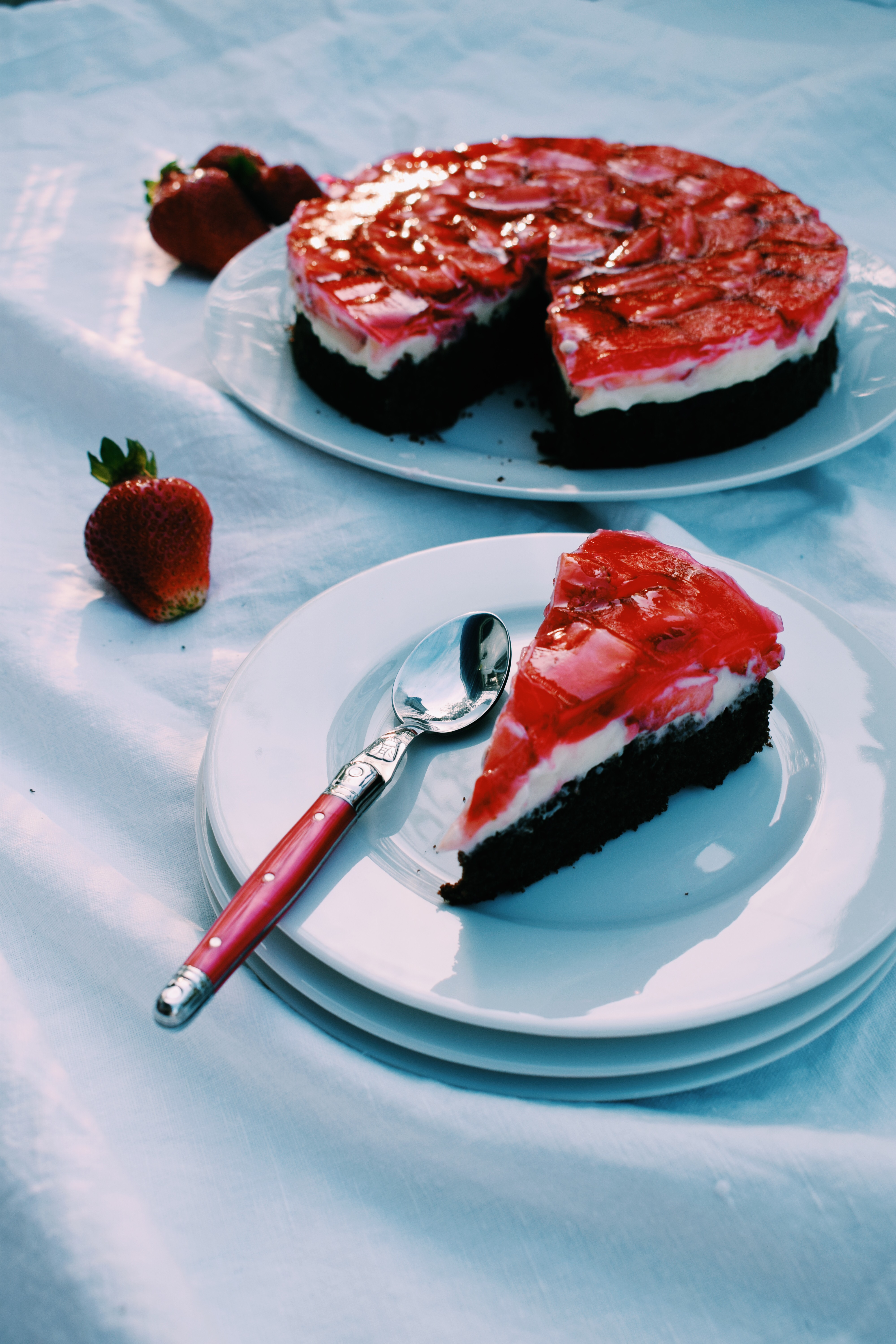 This is actually a really simple recipe, a soft chocolate sponge, topped with a white chocolate cheesecake mixture, sliced strawberries and red gelatin or jelly! This is a really nice summertime treat!