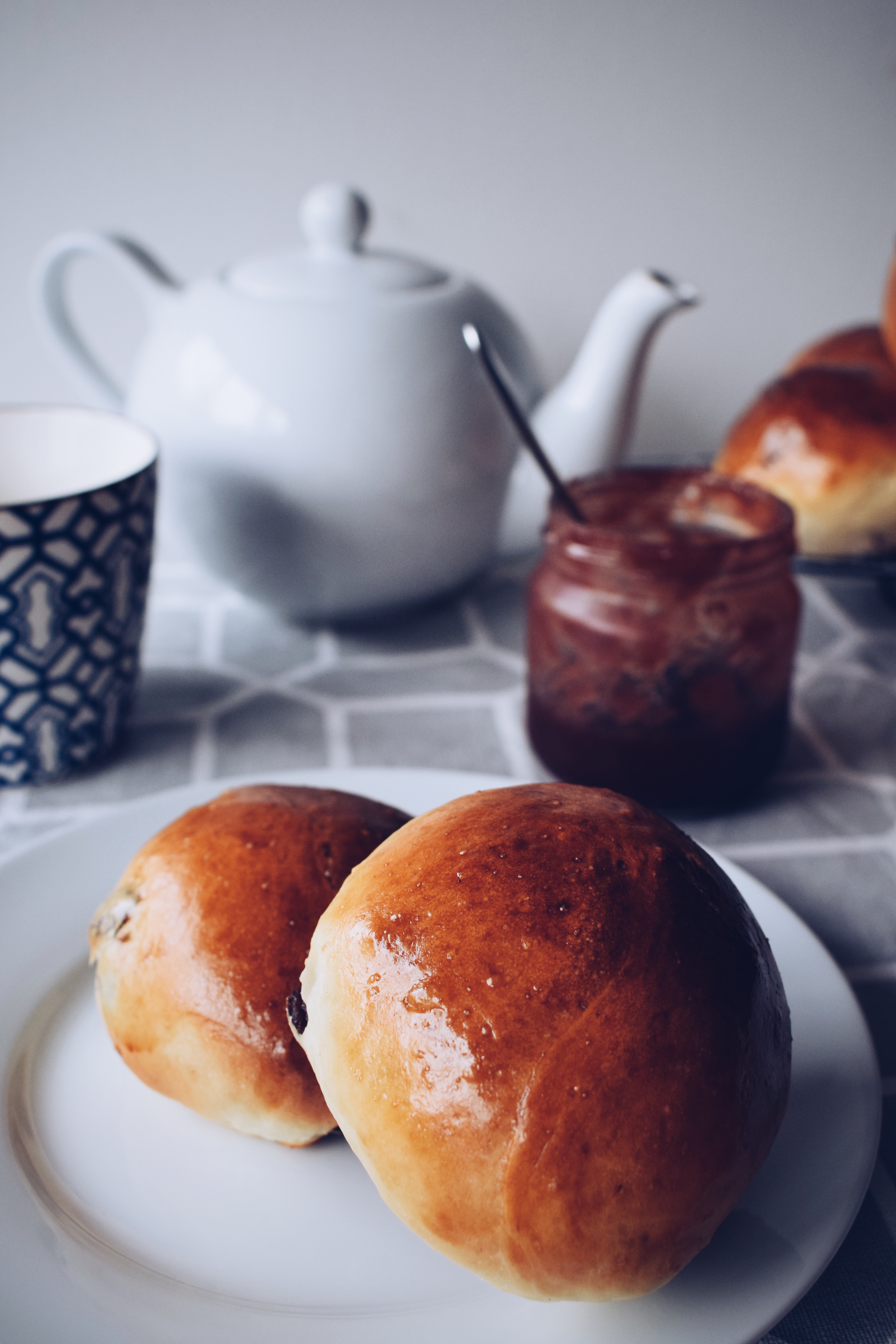 These bread rolls are really soft, white bread rolls which are enriched with butter and an egg and raisins throughout the dough. I find this best when they are warm out of the oven and don’t think they need anything with them. Tim is always pleased when I make something savoury or a bread bake, so he was really happy with this months challenge too! Thanks for the suggestion Greta!