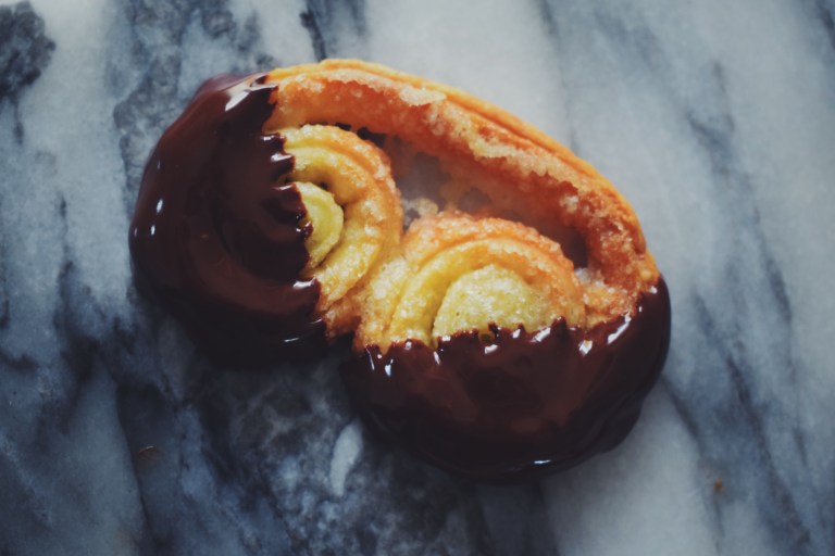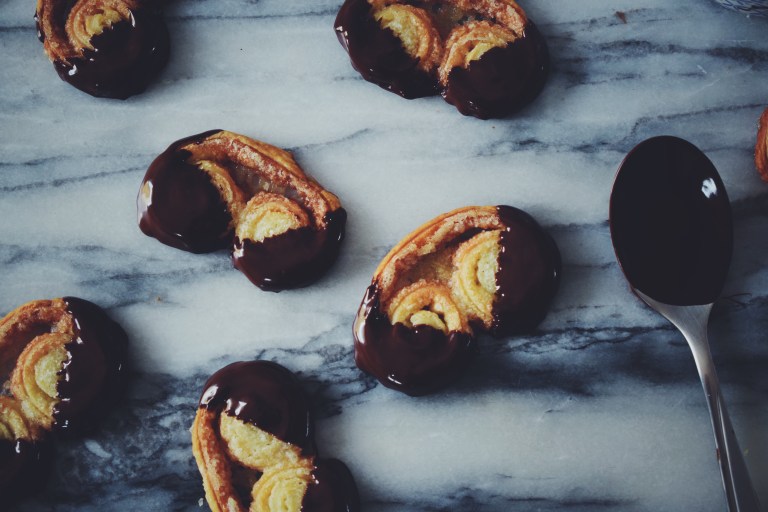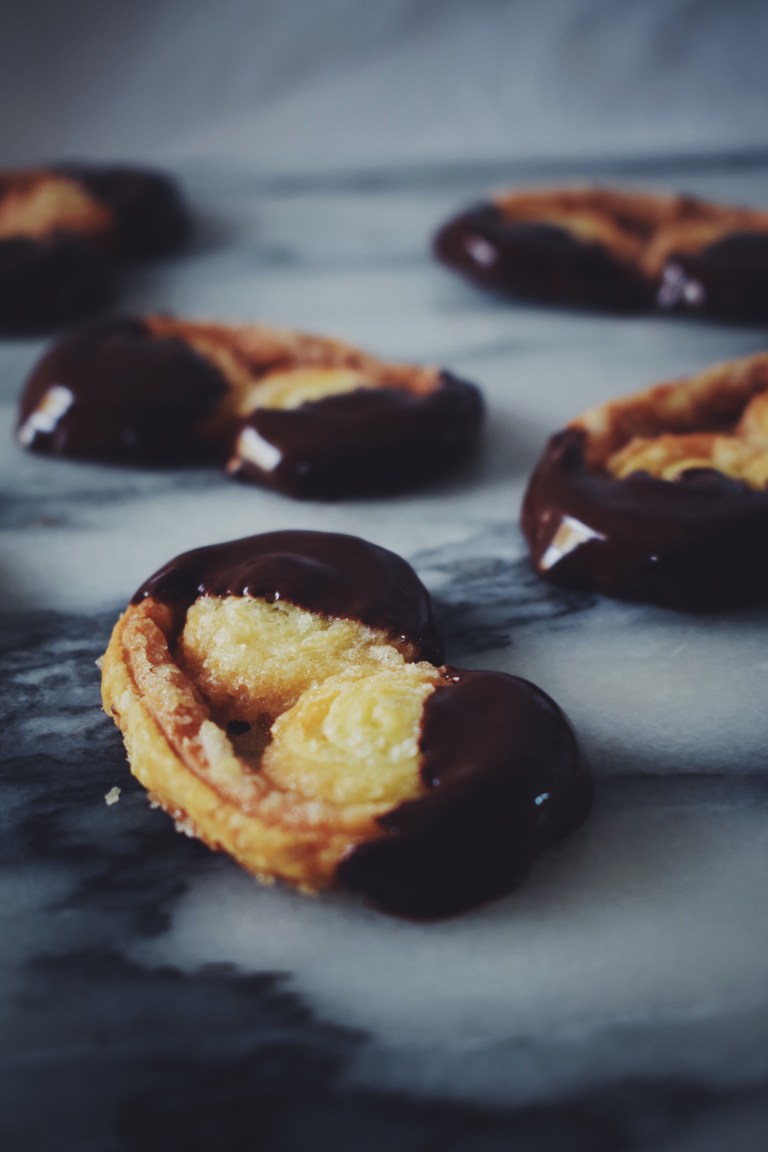 Greta challenged me to make Schweinohren, which translates as pigs ears. I quickly found a recipe which was very simple. All you have to do is roll out a sheet of puff pastry, brush with water and sprinkle over some sugar. Roll up both ends and put the whole thing in the freezer to harden up. Once it has hardened, take out of the freezer and cut into slices. Bake until golden and dip in chocolate! So simple!